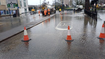 Our teams on site have stopped the water flooding, and are now working to clean the area and make it safe to open the roundabout to traffic as soon as we can. We're working with the emergency services to keep everyone safe. Traffic controls remain in place to protect the public, if you're travelling in the area, please allow additional time to your journey. Apologies in advance for any delay this may cause.